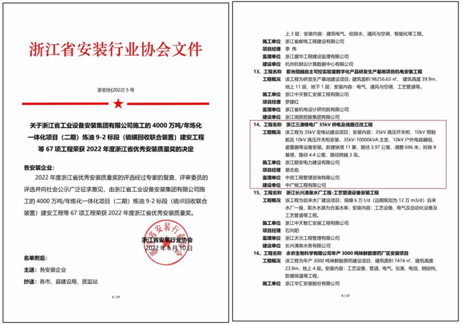 2022年度浙江省優(yōu)秀安裝質(zhì)量獎