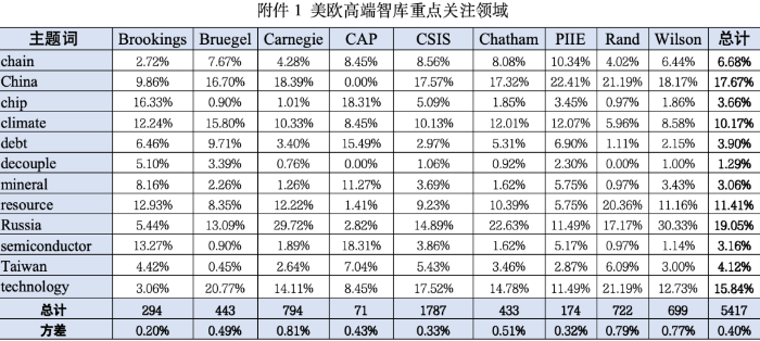 一、研究背景 美歐智庫是全球智庫體系中的重要組成部分,其發展起步較早,發展模式較好,行業規范更成熟,是美歐國家的重要政策智囊,在全球高端輿論體系中有著重要的地位。總體來看,美歐智庫在數量和影響力方面處于世界領先地位,其發布的觀點、分析和評論也成為了當下了解美歐國家政府內部認知和社會公共輿論的一扇重要窗口。 一般對于智庫的研究報告都以文獻閱讀、分析、總結為主,多針對一篇或幾篇報告進行分析。這種研究方式的優勢是分析更為透徹和深入,但是由于個人精力、關注方向的局限性,容易陷入“信息繭房”,對整體方向的把握比較散亂。本報告屬于美歐智庫成果大數據研究系列,旨在持續跟蹤美歐智庫研究動向,更全面了解美歐國家對國際政治、經濟貿易、中國發展等關鍵領域的認知情況。 二、樣本選取 研究樣本選取美國布魯金斯學會(Brookings)、美國卡內基國際和平基金會(Carnegie)、比利時布魯蓋爾研究所(Bruegel)、美國戰略與國際問題研究中心(CSIS)、英國皇家國際事務研究所(Chatham)、美國蘭德公司(Rand)、美國彼得森國際經濟研究所(PIIE)、威爾遜中心(Wilson)和美國進步中心(CAP)等9家智庫。 樣本報告研究覆蓋關于中國、產業鏈、芯片、氣候、債務、脫鉤、礦物、資源、俄羅斯、半導體、臺灣、技術等相關領域的研究報告,共計5417篇。 三、文本數據分析 (一)各智庫關注領域 2023上半年,各歐美智庫與中國、俄羅斯等相關的主題報告占比在五分之二左右,與供應鏈、芯片產業、半導體產業、礦產產業、脫鉤等相關的主題報告占比在五分之一左右,與氣候、資源、債務等相關的主題報告占比約五分之一,與臺灣、科技主題相關的報告約占五分之一。不同主題下智庫關注的重點領域分析參見附件1。 1.布魯蓋爾:中國和科技 布魯蓋爾研究所注重中國問題和科技前沿產業的研究。在限制中國科技發展的問題上,布魯蓋爾指出,越來越多的研究員擔心美國在基礎研究方面的開放可能過于支持競爭對手。隨著科技水平在一些關鍵領域取得的重大突破、全球化信息環境的形成、以及國際經濟聯系的深化和多樣化,各國的相互依存將不可分離,高技術產業針對某一國家和地區進行全面封鎖將愈加困難。在科技前沿產業研究中,布魯蓋爾對由國防部、聯合作戰指揮部、海軍、海軍陸戰隊、國防機構和國防情報部門聯合資助的蘭德公司國防研究所進行了重點分析,認為美國應繼續通過軍工聯合體推進前沿科技轉化的研究工作。 2.布魯金斯:芯片和資源 布魯金斯學會的研究領域較為廣泛,其研究相對側重芯片和資源。布魯金斯認為美國利用其在國際組織如多邊開發銀行中的股權影響力,支持美國在外交、安全和經濟方面的政策和活動,特別是對芯片技術的封鎖。布魯金斯通過對關鍵礦產供應問題的大量分析,如美國和日本宣布的關于電池礦物采購、美國對加拿大礦業項目的融資貿易協議,提出應加強關注部分關鍵產業供應鏈上游礦產品,目前美國部分利益團體已經加強該類產品的供應安全,對相關風險有所警惕和防范。 3.卡內基:中國和俄羅斯 卡內基國際和平基金會的研究具有鮮明的特色,以俄羅斯、中國問題為研究重點,相關報告約占其研究報告總量的一半。針對俄羅斯,卡內基提出目前正在美國執行的三大舉措包括加強對烏克蘭的戰爭支持、維持對俄羅斯的制裁和加強北約的東部防線,成功搭建了遏制俄羅斯發展的政策框架,未來應立足這三大核心進一步強化對俄政策。圍繞烏克蘭提出的《基輔安全協議保障草案》,美國仍在權衡是否將目前的支持轉化為更持久的框架。卡內基提出,美國對烏克蘭的軍事援助已經在美國政府內部產生爭議,特別是美國總統選舉即將到來的窗口期日益臨近,各個候選人團隊會在這段時間重新研究對烏援助計劃,以爭取選民和國內各勢力的最大限度支持。針對中國,卡內基多名研究員提出拜登政府的國家安全戰略將中國作為最重要的地緣政治挑戰,未來會加強澳大利亞、英國和美國組成的三方安全伙伴關系,將其逐步培養成印太地區最強大的軍事力量之一。 4.蘭德:中國、俄羅斯和科技 蘭德公司延續了其對中國、俄羅斯和科技前沿的關注。蘭德重點分析和權衡了中俄戰略地位,雖然短期內美國由于烏克蘭戰爭而全面回歸歐洲安全事務,但是長期來看美國的戰略關注重點仍然是中國。同時,部分研究提出對烏克蘭的援助不僅是對一個主權國家生存空間的支持,也可以將烏克蘭視為一個潛在的投資目的地,將烏克蘭作為戰略合作伙伴開展經濟貿易等領域的合作,以經濟利益來緩解國會中懷疑的聲音,換取更多國內利益相關團體的支持。在科技領域,蘭德公司從俄烏戰爭需求的角度對部分前沿科技進行分析,如在網絡安全領域,美國的一些私營部門為烏克蘭政府提供了關鍵的網絡安全技術支持,大大削弱了俄羅斯的網絡攻擊效力。 5.戰略與國際問題研究中心:科技和俄羅斯 CSIS的關注重點是科技和俄羅斯問題。在科技領域,CSIS提出加強對量子技術的研究。目前量子技術仍處于初級階段,但戰略意義重大,中國已經在相關領域占據優勢,特朗普和拜登政府以及過去幾屆國會都采取了積極措施促進其發展,在未來幾十年中是重要的科技發展方向。在俄羅斯問題上,CSIS指出油業稅改是普京上臺后的首個重要經濟政策步驟,